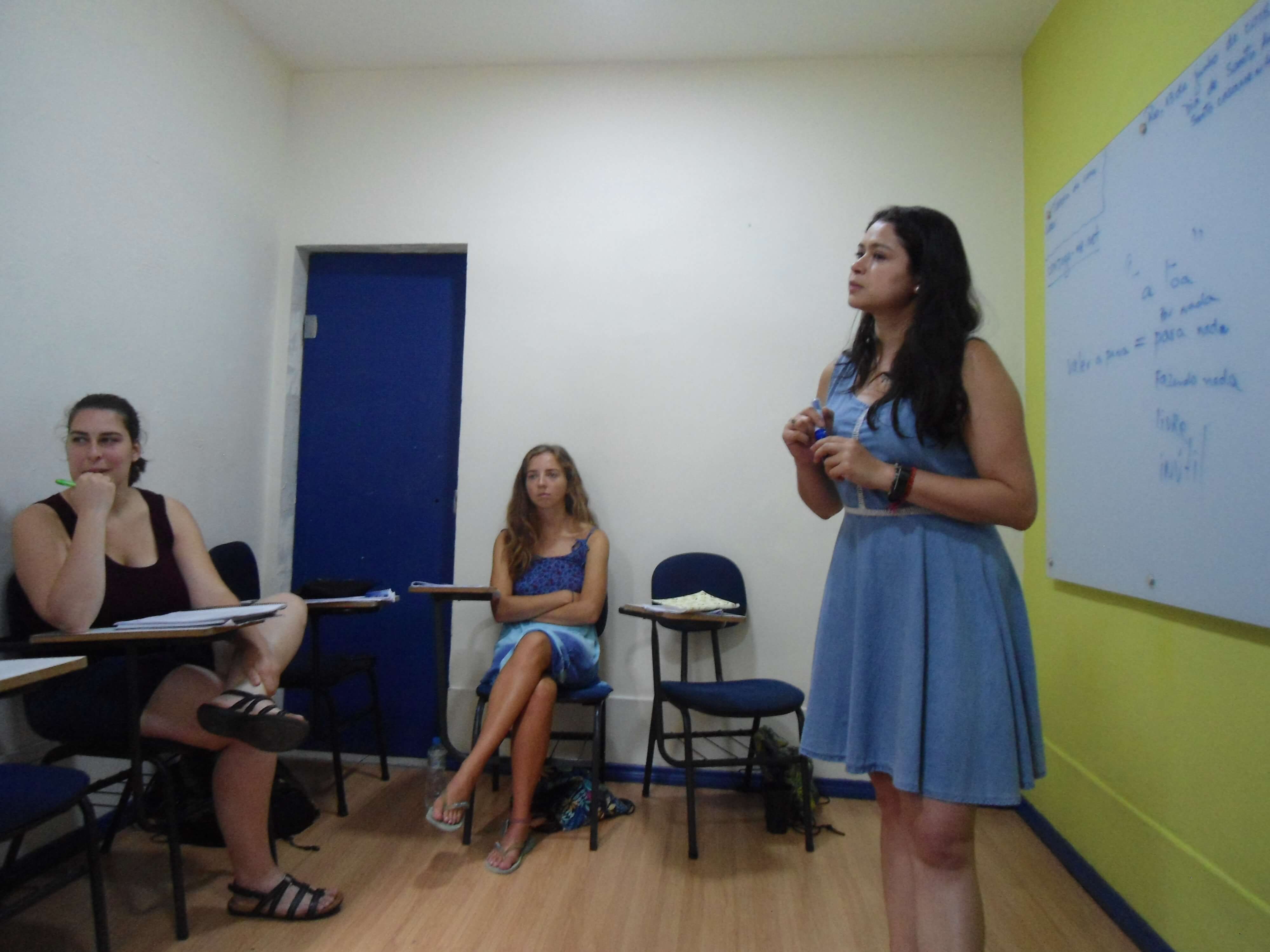 Professora Sônia está usando um vestido azul. (Teacher Sônia is wearing a blue dress.)