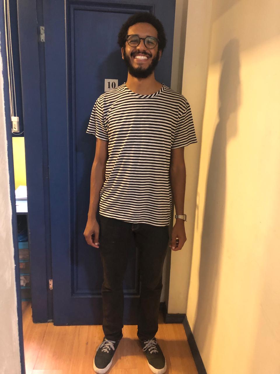 - Davi está usando uma camisa listrada, calça jeans e tênis. (Davi is wearing a striped shirt, jeans and sneakers.)