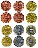 Nas moedas, a frente também retrata a efígie da república, enquanto o verso é representado por um herói nacional. As moedas brasileiras também têm tamanhos e cores diferentes.